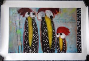 “Udstoppet næsehornsfugl” (1923) fra Karen Blixen museet i ramme med glas på 65×103 cm.