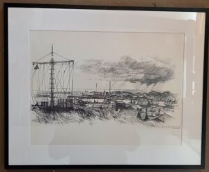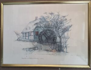 “Østjydsk Bindingsværksgård fra True”- Tegnet for Dansk ESSO A/S i 30×40 cm ramme.