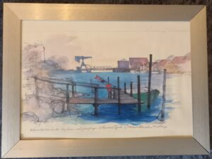 “Karrebæksminde. Vippebroen ved udgangen til Karrebæk Fjord & Næstved Kanal” i 35×25 cm ramme.